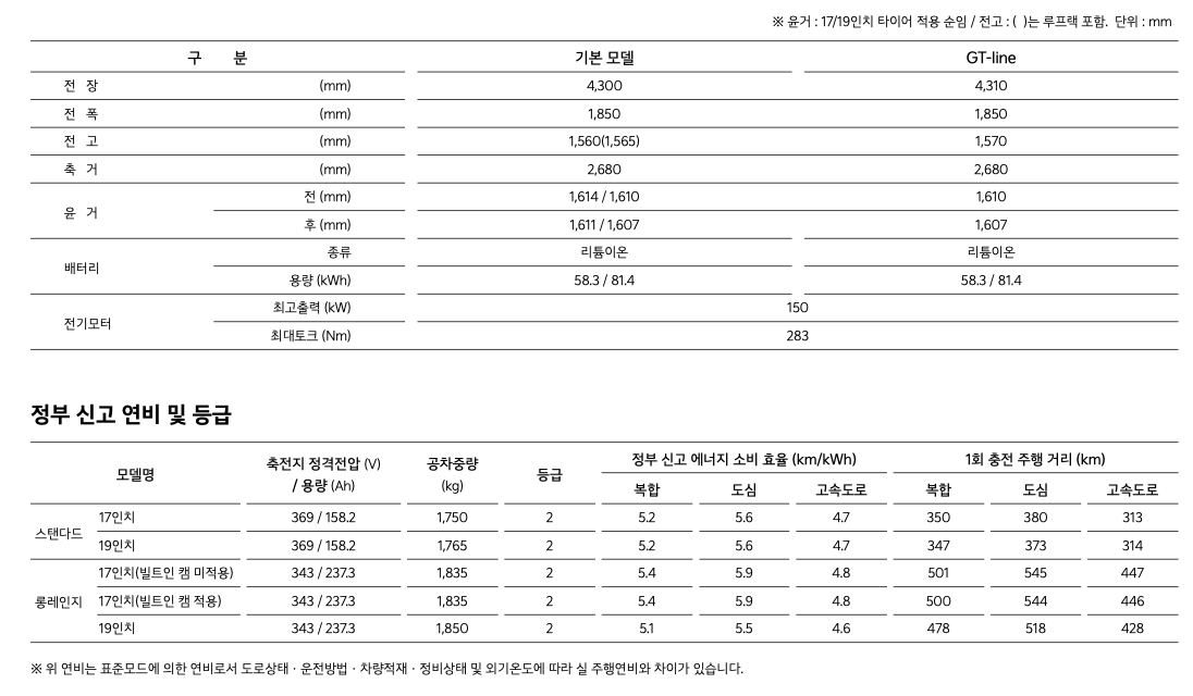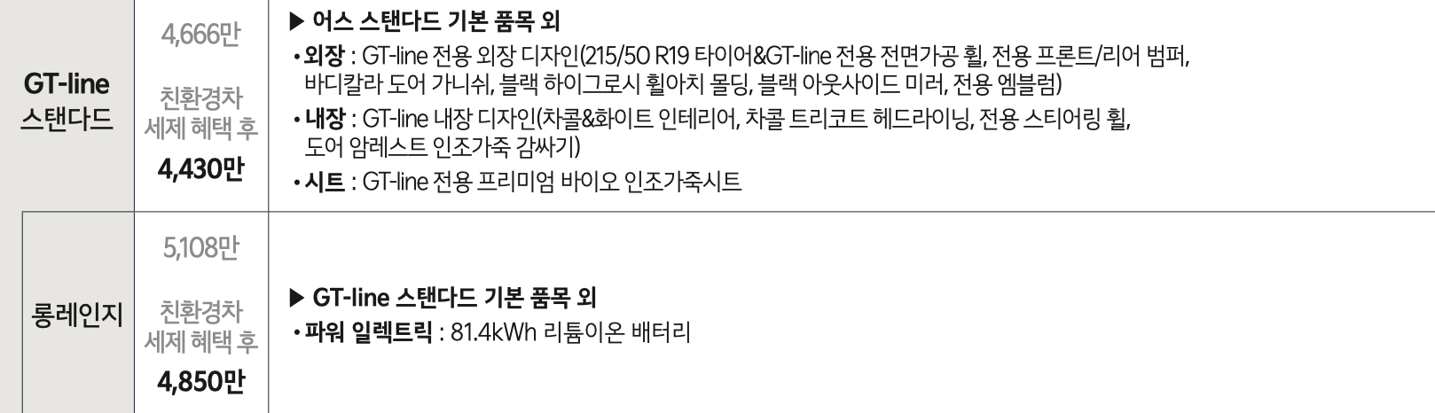 - 스탠다드: 전기차 입문자에게 적합한 실용적인 모델.