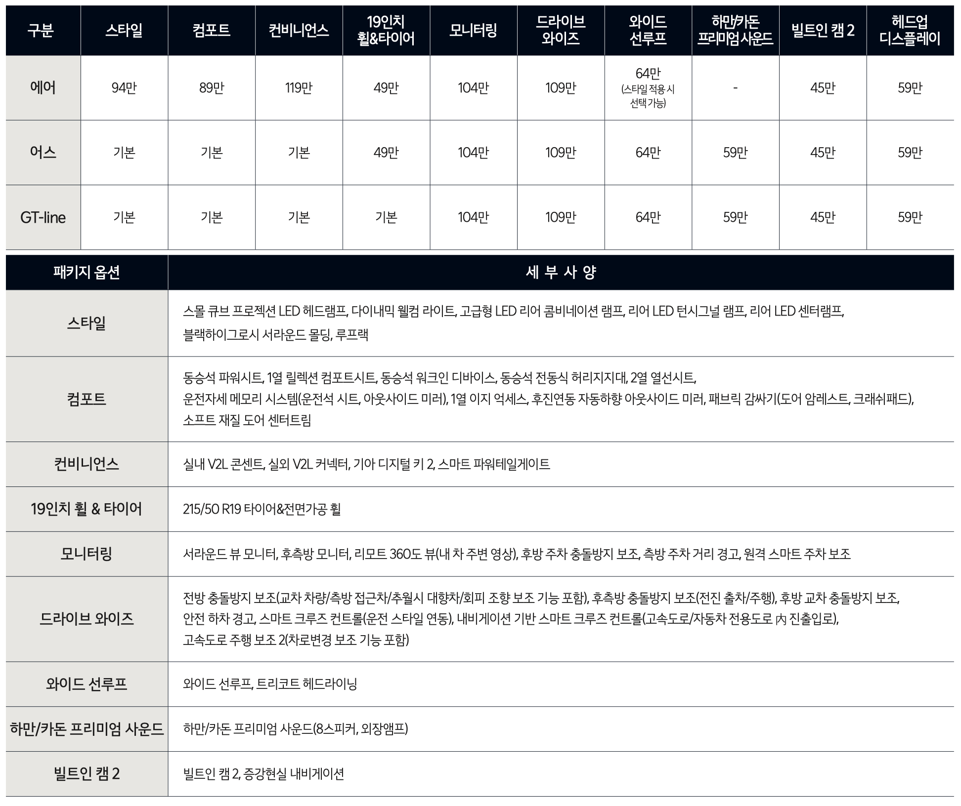 - 겨울철 사용을 고려한다면 열선 스티어링 휠과 히팅 시트가 포함된 ‘컴포트 패키지’를 추천합니다.